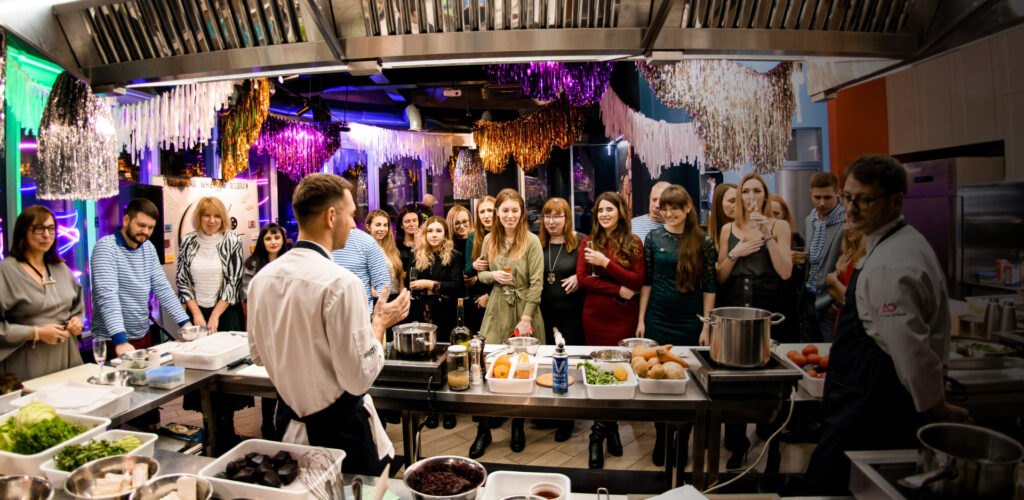 Потім гостей проводять у кухонну зону, де шеф-кухарі озвучать меню вечора і формат майстер-класу. Наприклад, учасники можуть працювати поодинці, парами або розділитися на команди і влаштувати гастрономічний поєдинок.